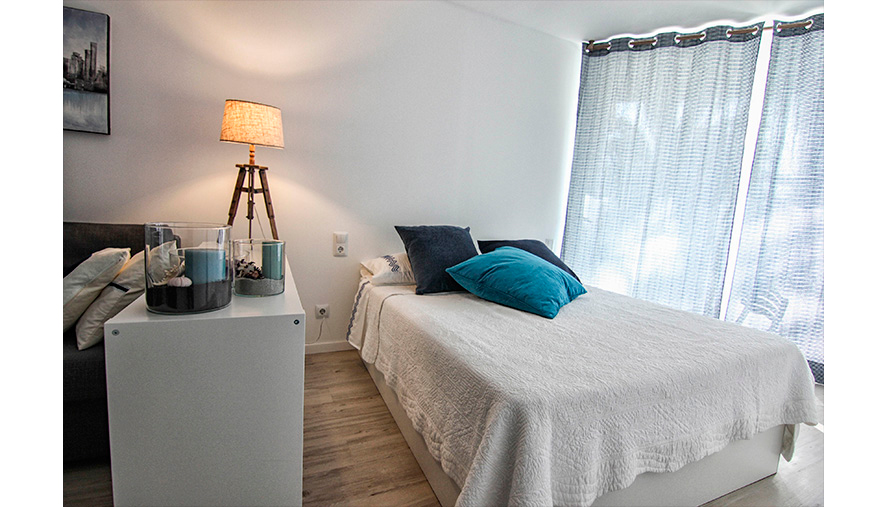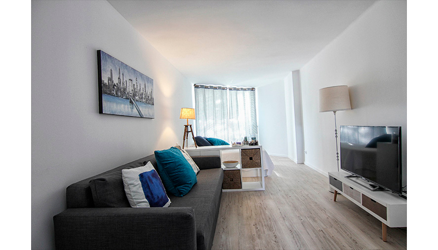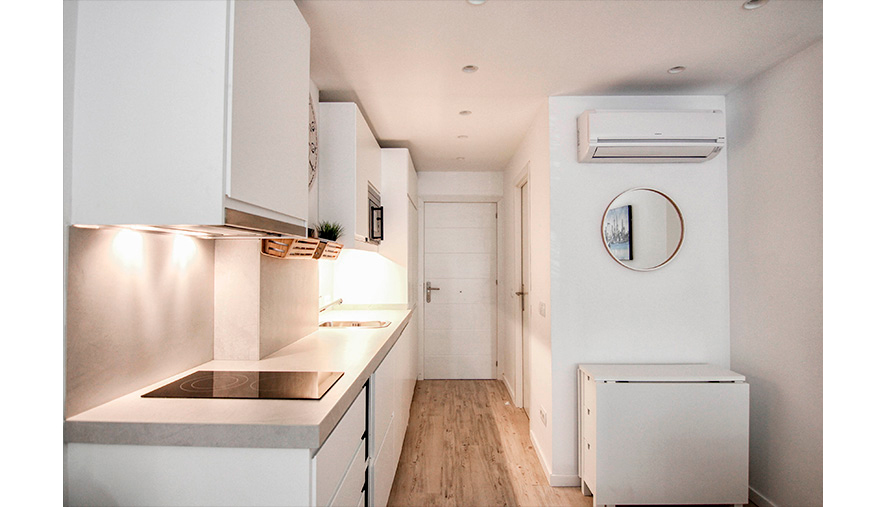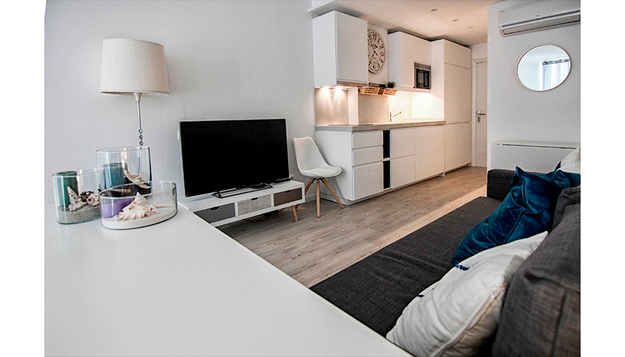 Reforma d’un petit apartament de platja, organitzat amb un únic espai, on la zona de dormitori, cuina i sala d’estar estan integrades aconseguint un espai més ampli i adaptable en funció del moment del dia i les necessitat.
