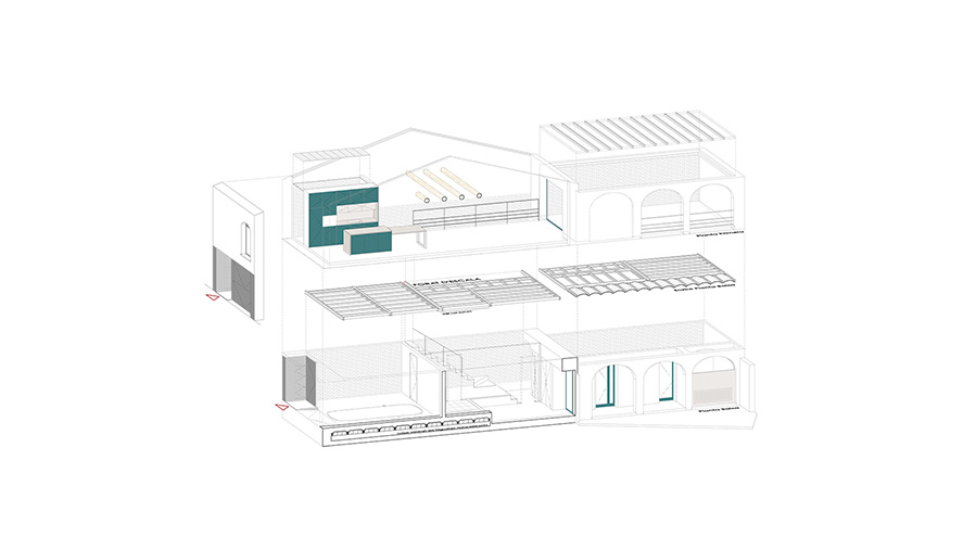 El projecte s'organitza en dues plantes. La planta baixa inclou l'accés a l'habitatge i la zona de dormitoris. La planta primera és una sala-cuina oberta a la terrassa posterior. És conserven les arcades i és descobreix la coberta.