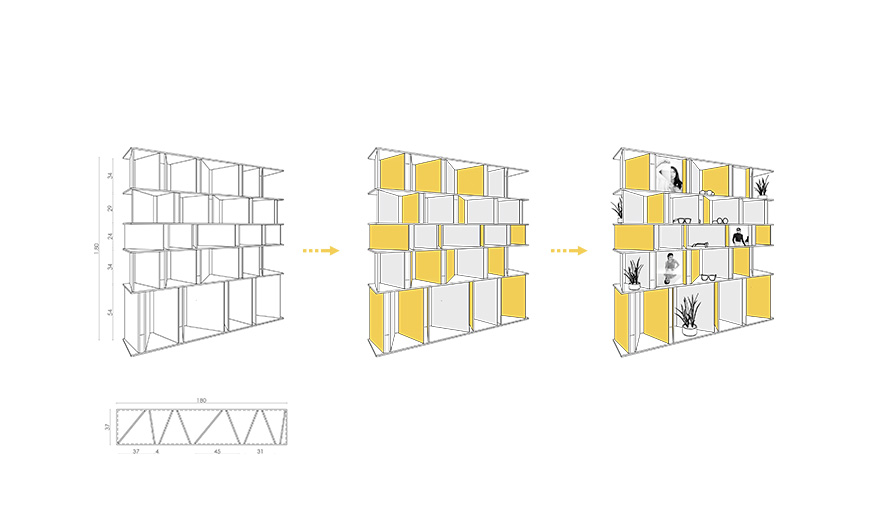 El concepte parteix de la idea de la gelosia mediterrània, el joc entre plans i reflexos a la recerca de presentar les ulleres generant punts de vista nous i inesperats .